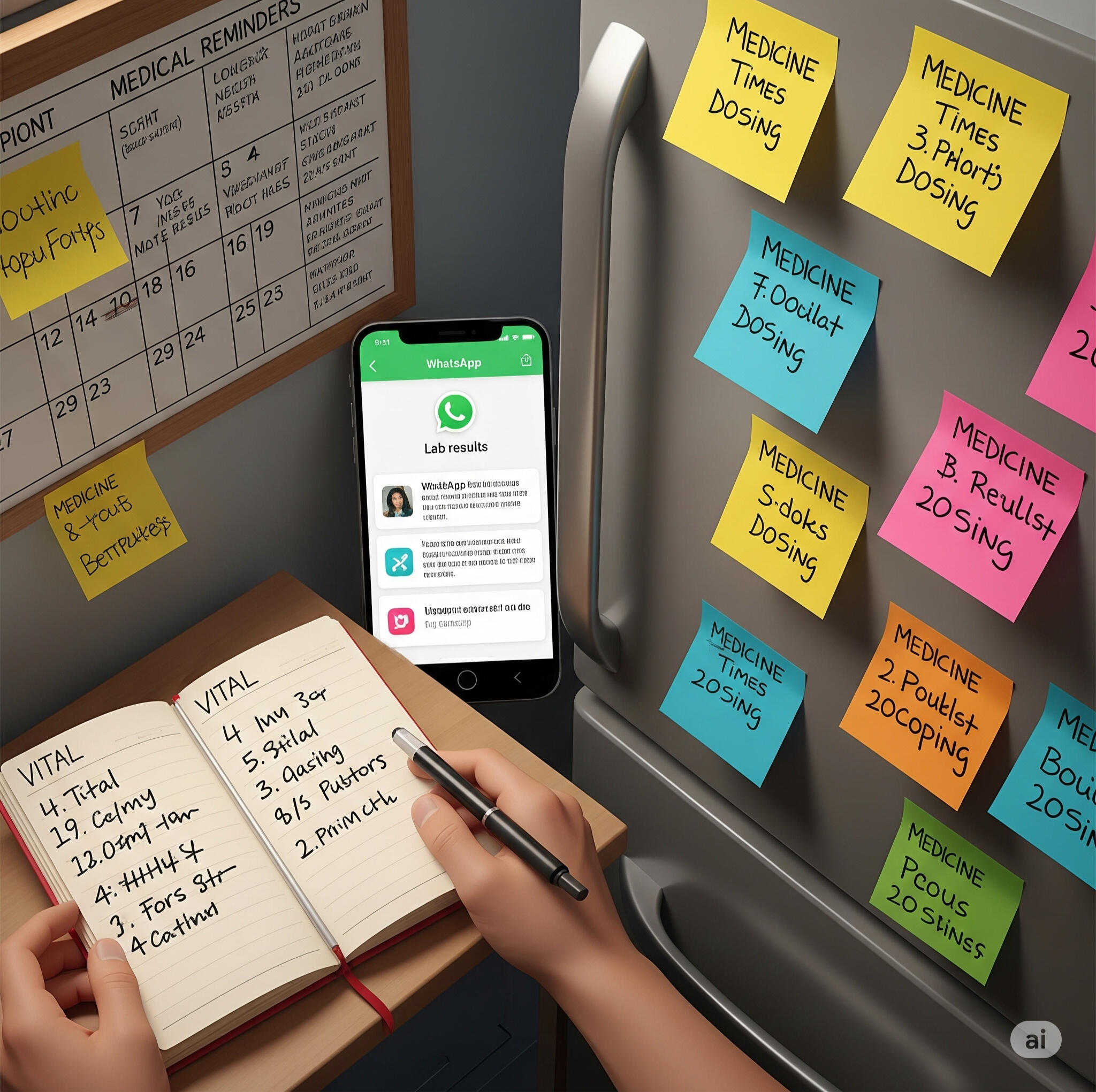 Vitals in notebooks. Prescriptions STUCK to the fridge.